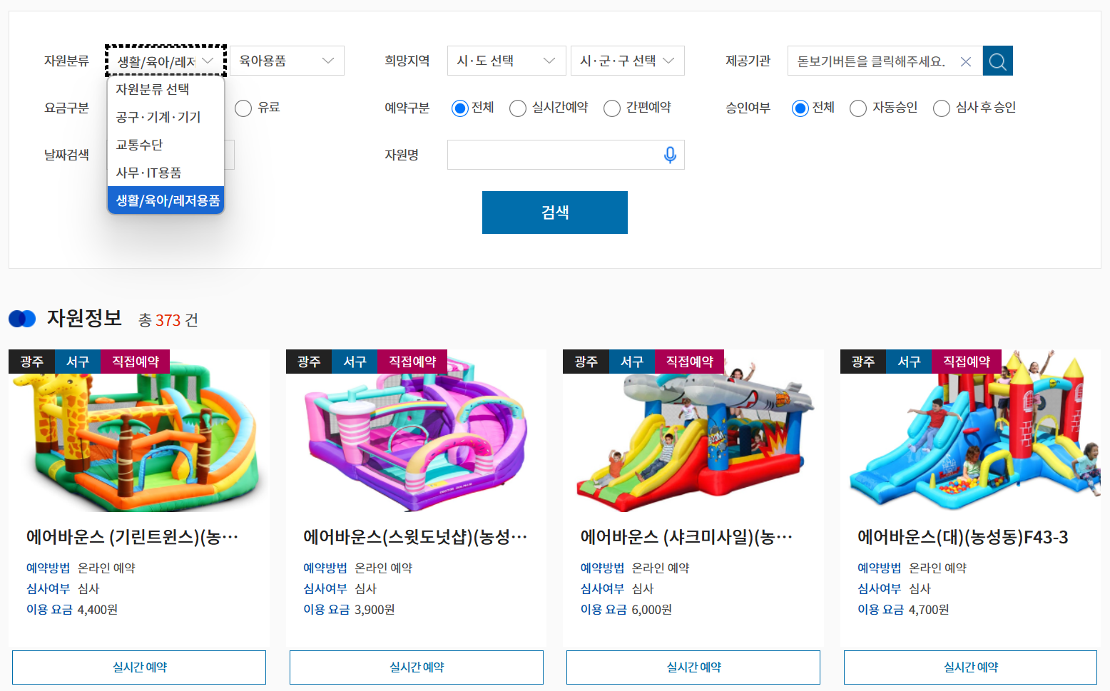 상단 검색창 또는 지도 검색 메뉴 이용 지역명, 기관명, 자원명(예: 회의실, 장난감 등)으로 검색 가능.